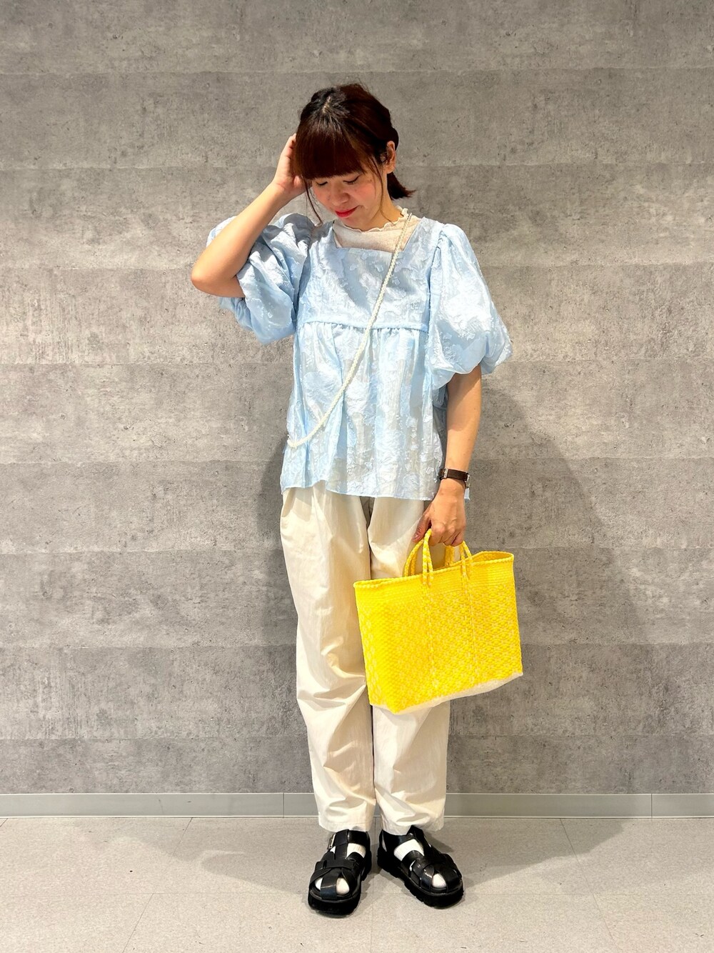 シアージャガード袖ボリュームブラウスを使った淡色コーデ* 首周りが少し開いている分レイヤードスタイルも作りやすくシアーのカットソーとも相性良かったです◎ パンツは38サイズでも大きすぎず、 素材もサラッとしてるので夏に向けても履きやすそうです。