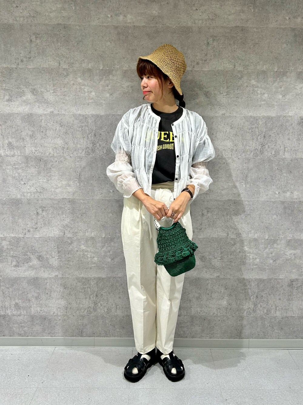 シャーリングボレロシャツを使ったモノトーンコーデ* 甘くなりすぎないようにバンドTを合わせてみました。 透け感があるのでインナー選びも楽しくなりそうです◎
