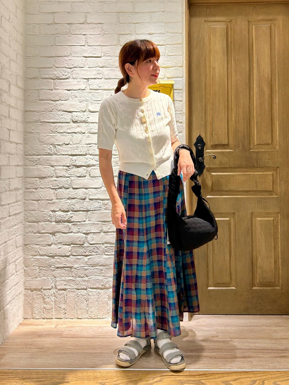 夏のニットコーデ* 重たくならないようにチェックフレアスカートと合わせてみました。 スカートはマルチカラーなのでベーシックな色のトップスとの相性もバッチリです◎