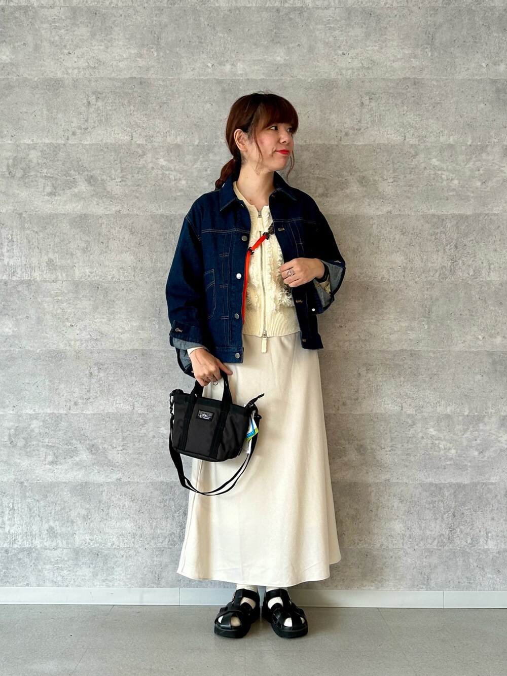 GEVACOのデニムジャケットを使ったレイヤードコーデ* ゆったりめなサイズなのでニットの上からも着やすく長い季節活躍出来そうです◎
