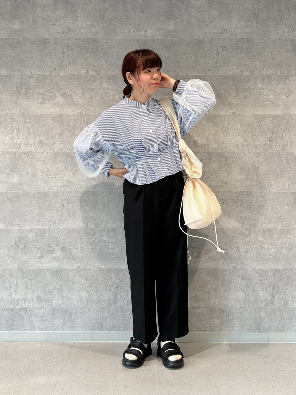 袖チュールクロップドブラウスを使ったカジュアルコーデ* クロップド丈なのでワイドパンツとの相性も良く羽織で着ても可愛いです♩