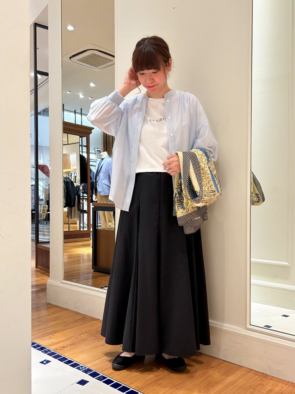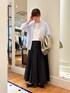 袖口シャーリングブラウスを使った春コーデ* ブラウスは透けすぎないのでインナーも選びやすいので着回ししやすそうです◎ ヴィンテージタフタマチ入りマキシスカートは ウエストがゴムで楽に履けますがフレアなラインで大人めに履いて頂けそうです♩