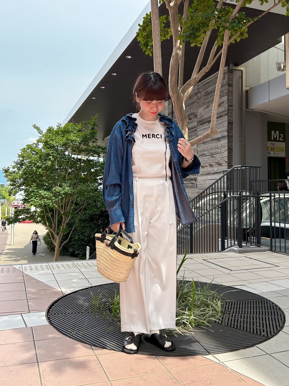 Rie Millerのフリルギャザーブラウスを使った大人カジュアルコーデ* 1枚着でも羽織でも使えるので万能に使えそうです。 ツイルイージーワイドパンツはウエストがゴムなので楽に履け、白でも透け感が出にくいので気軽に使えそうです◎
