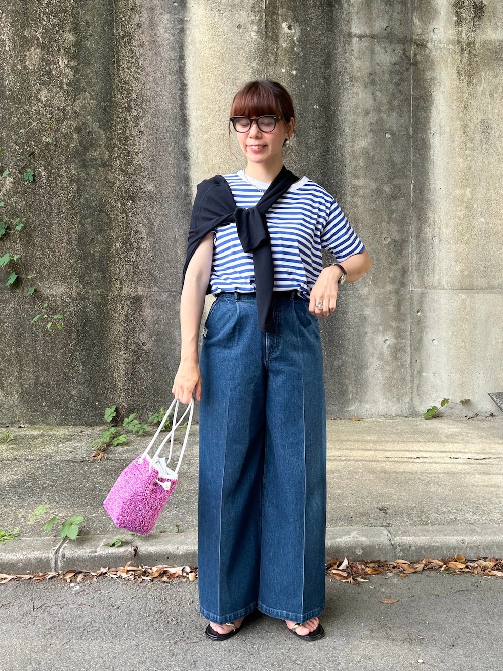 Rie Millerのボーダー半袖Tシャツとワイドスラックスデニムを使ったコーデ* ワイドスラックスデニムは最初窮屈感がありましたが生地が馴染むと伸びてきたので楽に履けました◎ センタープレスが入ってるので幼くなりすぎずTシャツ合わせでも綺麗に仕上がります。