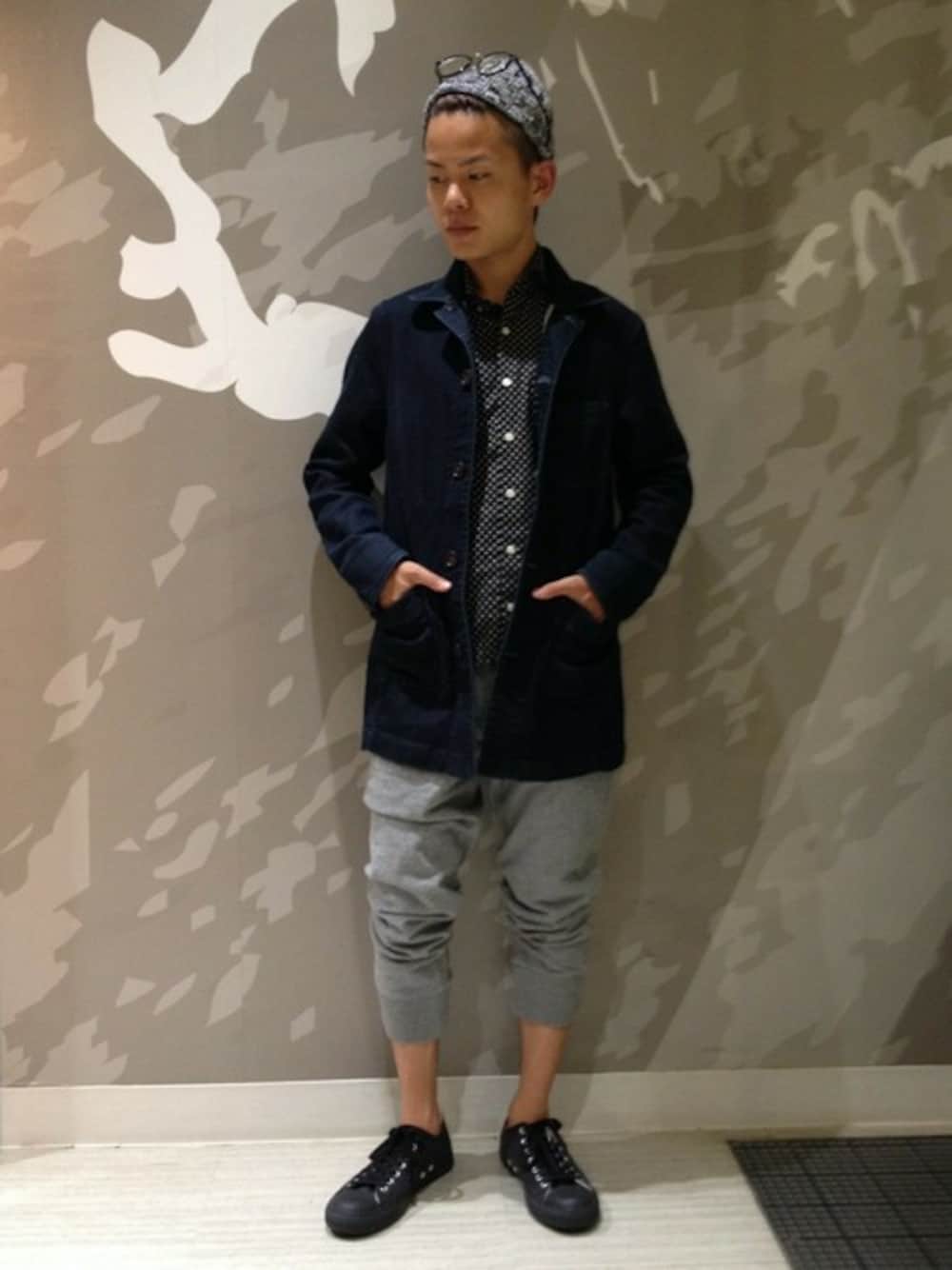 初秋のカジュアルコーデ。 シャツ・コートといった定番アイテムを、あえてスウェットパンツ・スニーカーといったカジュアルなアイテムで合わせ、ストリート感を出しました。