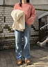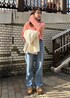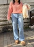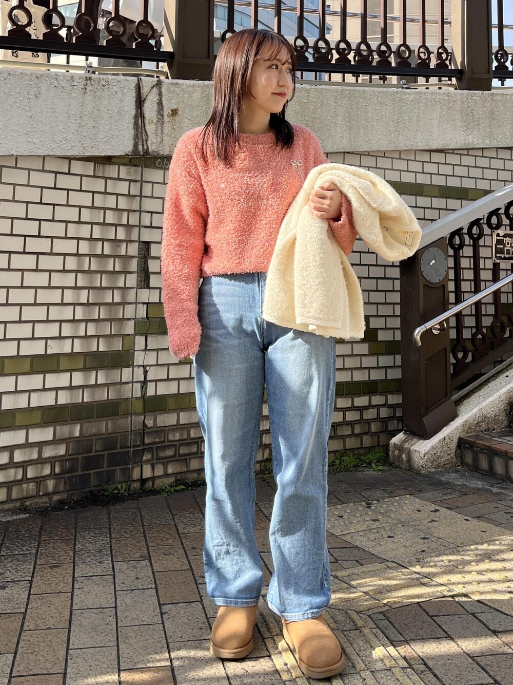 カラーが映えるピンクニットに王道のデニム合わせでシンプルなコーディネート。