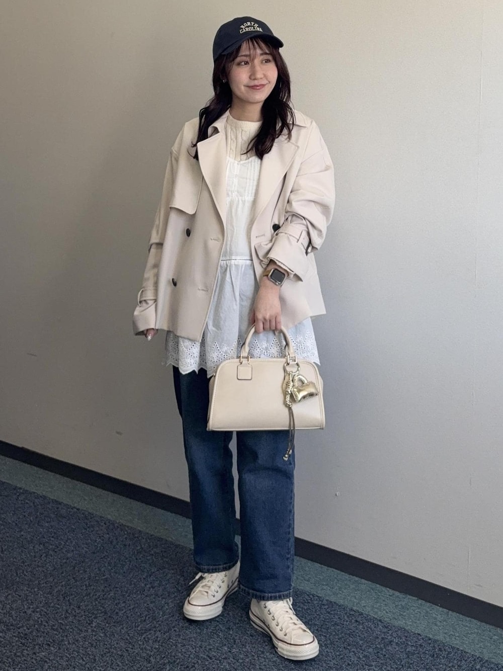 春らしあれトレンチコートを使ったカジュアルコーデ。 甘めなレースにデニムやキャップを合わせてカジュアルさもプラスしたコーディネートです。