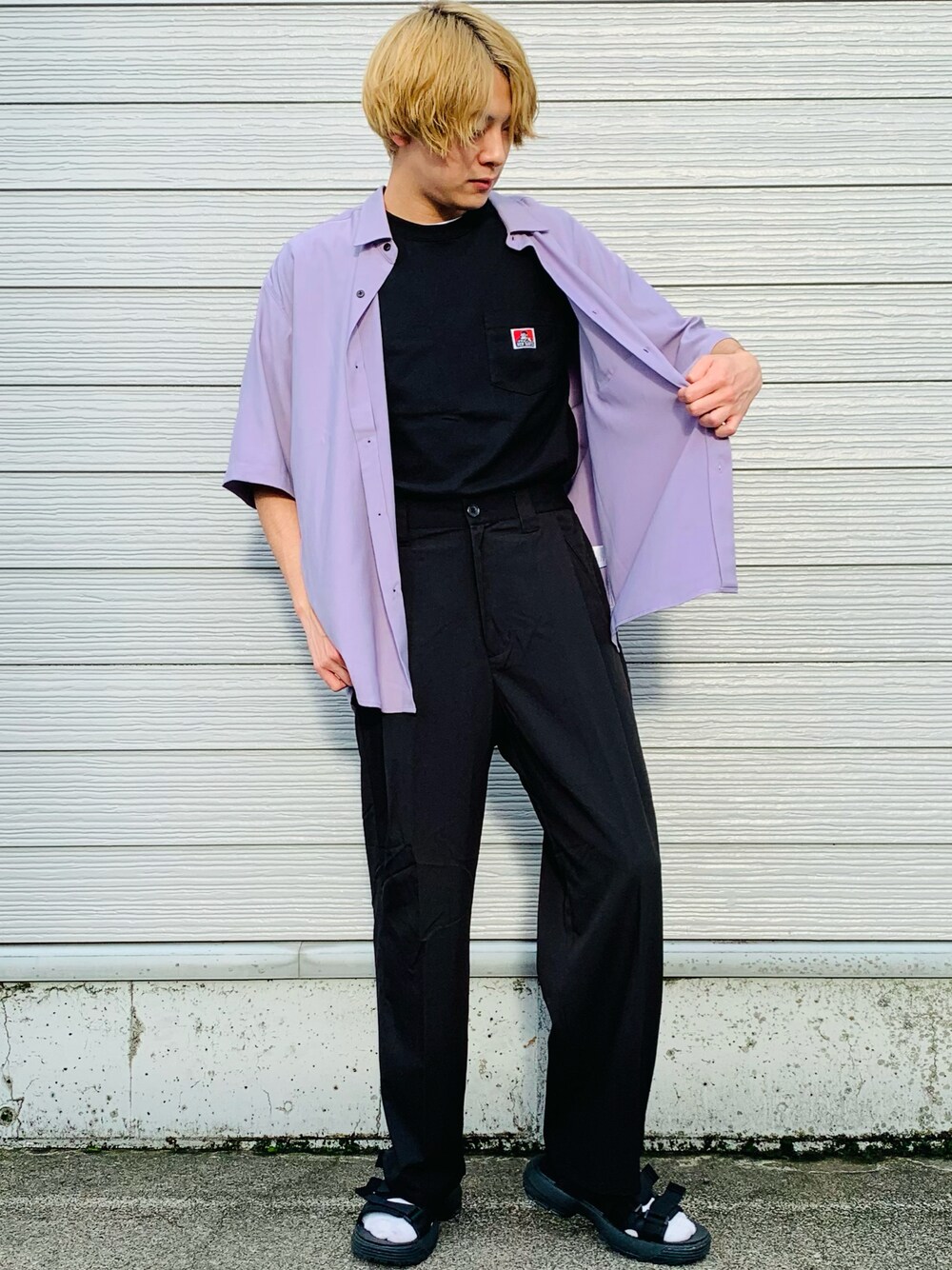 シャツの色味をより際立たせるため他をブラックで統一しました🦖 シャツ、パンツの素材は光沢感のある物を選びゆったりとしたスタイルですがきれいに見えるようにしています。 モノトーンの上に着ることでシャツが目立ちブラックコーデでも少し華やかな印象になります。
