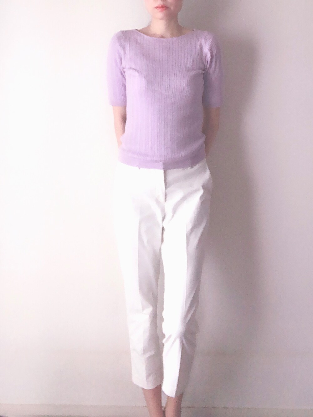ラベンダーカラーのニットに白のパンツを合わせました。ラベンダーはサマーさんの透明感をより引き立ててくれる色です🌼 上下合わせて3000円以内のコーデです。