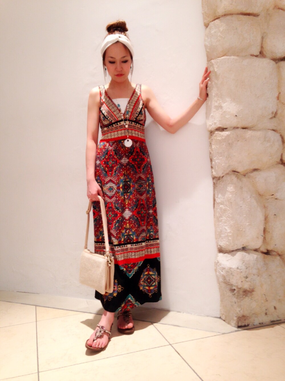 こちらはUSA発のレディースアパレルブランド、「ANGIE」のワンピースです! 人気海外ドラマ「The Hills」で着用されたことでも有名な、 今とても注目のインポートブランドです。 今回、私が着たマキシ丈ワンピースは色柄が三種類あり、カシュクールデザインで女性らしく、ラインがとても綺麗に仕上げられています。 後ろはシャーリングゴムになっているので、フィット感も抜群です! 夏のリゾートウェアに是非おすすめの一枚です(^ν^) 「ANGIE」はリゾート系、エスニック系アイテムが沢山揃っており、店舗限定商品なので、ぜひコレットマーレ桜木町店にいらしてください! お待ちしております(^-^)/