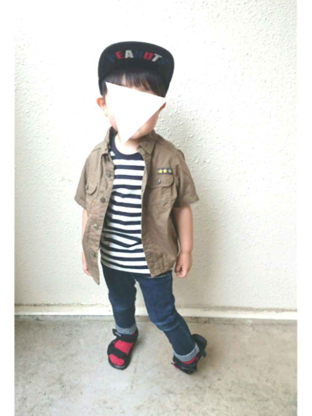 ブルー系のデニムパンツを着用したキッズの夏コーディネートの1枚目の写真