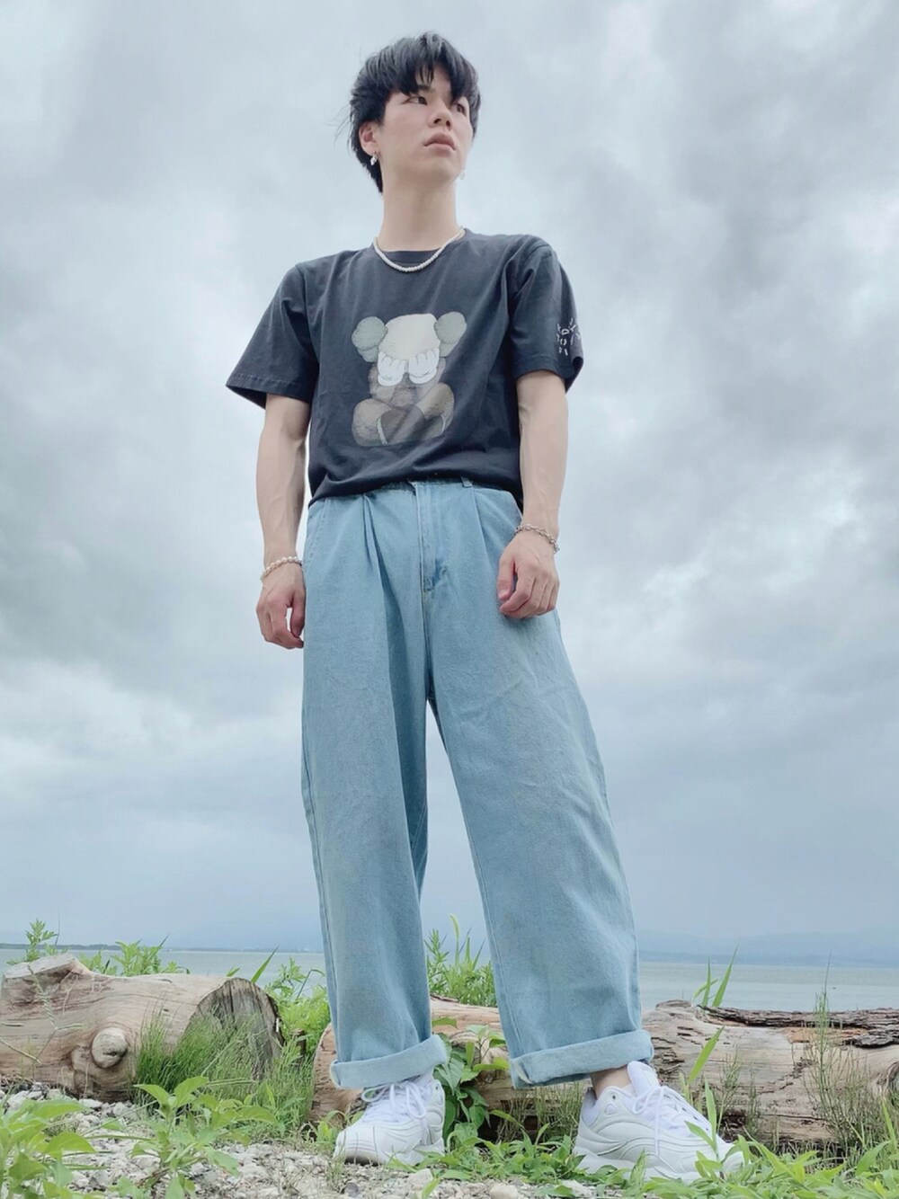 いつも見て頂きありがとうございます😊 いいね👍 お気に入り💜 フォロー⭐ 凄く励みになってます! 琵琶湖の前で撮ってもらったコーデです☀️ 黒×青×白でコーディネートを組んでみました! 皆さん、黒Tシャツを着た時ってどんなパンツと合わせることが多いですか??✨ 自分はアイスウォッシュデニムと合わせるのが1番好きです💙 KAWSコラボのTシャツ好きなので、販売して即買いしたのに、投稿するのめっちゃ遅れてしまいました😓 シルバーのアクセサリーで合わそうと思ったんですけど、ありきたりかなと思ったので、パールを使ってみました✌️ もしこの投稿が気に入って頂けたら、いいね・お気に入りお願いします💚 フォロー・コメントもお待ちしております😆 Instagramも頑張っていこうと思いますので、チェックしてみて下さい😊 DMもお待ちしております🤘 Instagram → hrt_cd0821