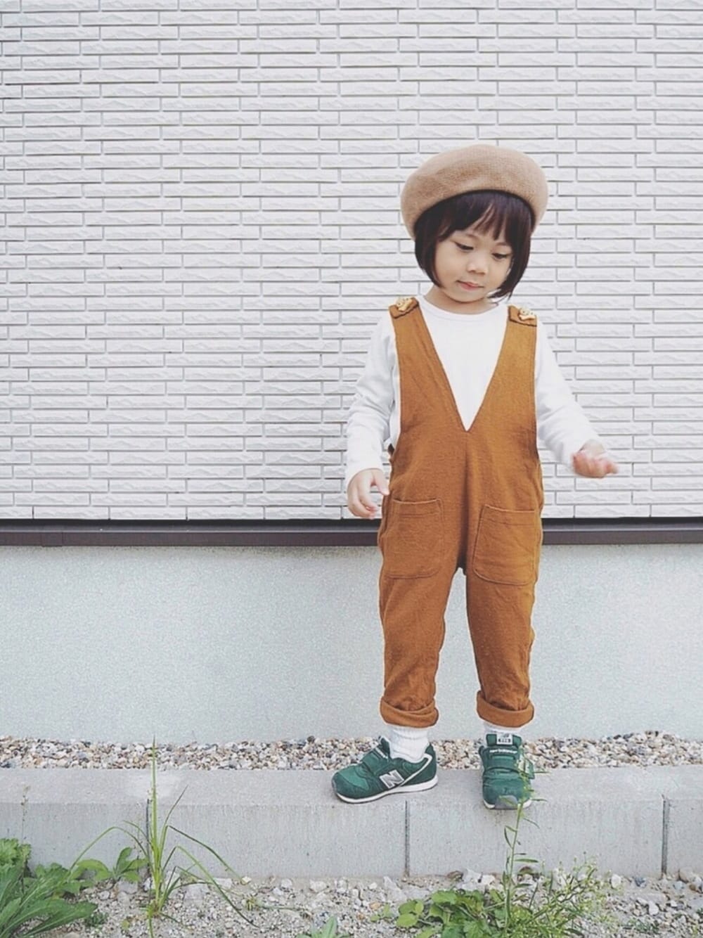 カーディガンを脱ぐとこんな感じ3歳9ヶ月 98cm 15kg 座高高めお腹ぽっこり男子 帽子→大人のフリーサイズ トップス→110cm サロペット→100cm 靴→16.5cm