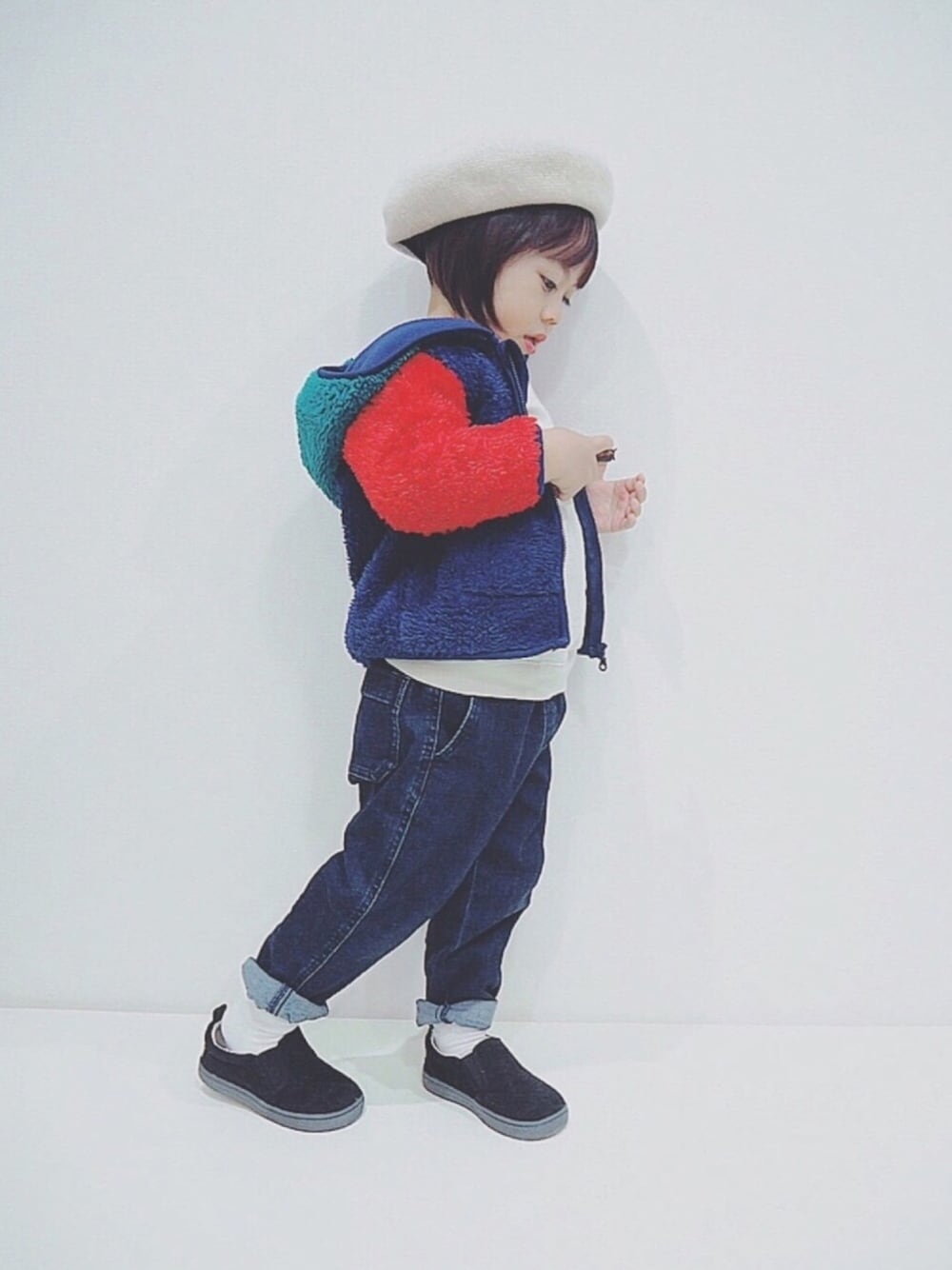 3歳9ヶ月 99cm 16kg 座高高めお腹ぽっこり男子 帽子→大人のフリーサイズ アウター→90cm トップス→110cm ボトムス→110cm 靴→17cm
