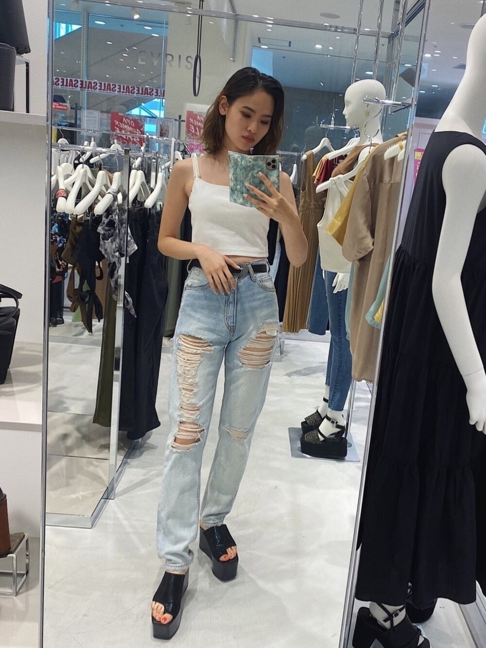 足の長さを強調してくれるデニム♡ ダメージ感も色味もこの夏 ほんとにおすすめのデニム! このヴィンテージ感がたまらない◎