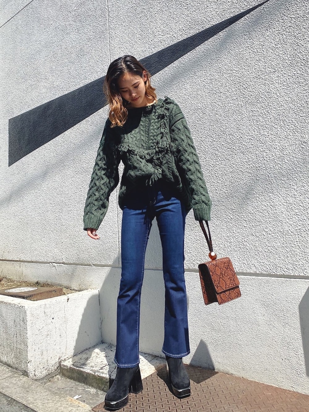 本庄 彩葵のニット/セーター「フリンジパッチワークケーブルニットプルオーバー」を使ったコーディネート