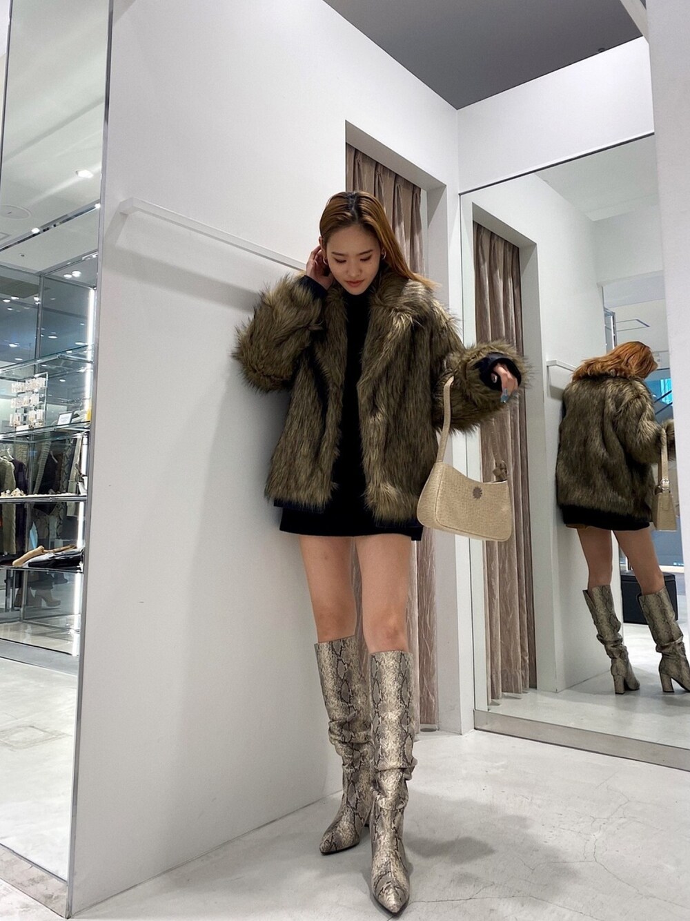 シンプルな黒のニットワンピに、ベージュ系で統一感のあるコーデに仕上げました❤︎毎年必須のEVRISのファーのコートはフェイクファーでありながら、MIXカラーの毛なので立体感もあり、毛足が長く抜けにくいので高級感のある1着です´◡`