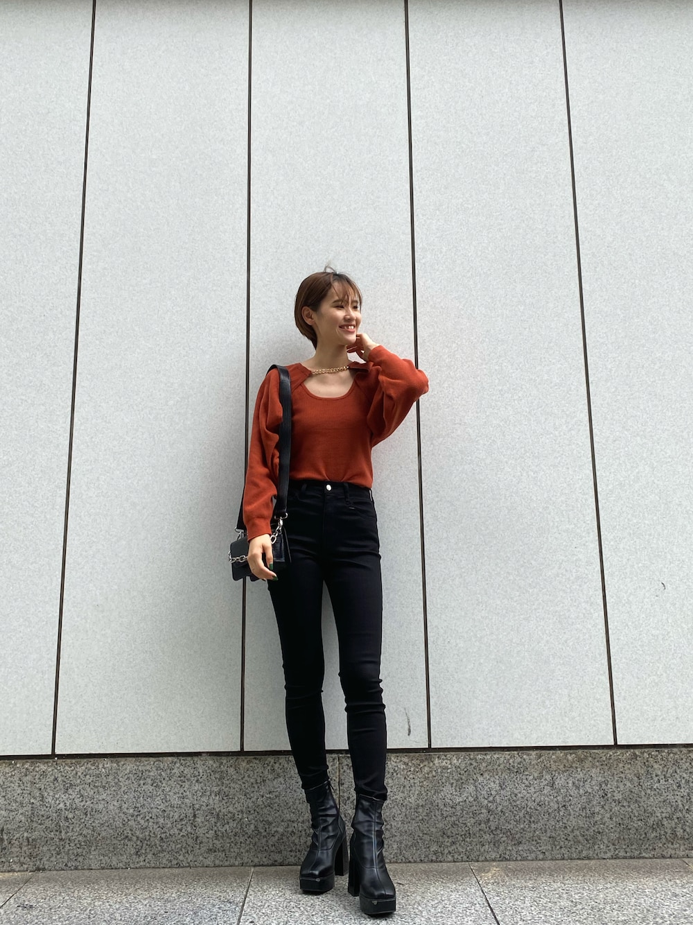 EVRIS大人気のチェーンニットをかっこよく黒スキニーで合わせてみました♡ 高さ10cmの厚底で合わせてさらにスタイルアップ効果◎ですよ☺︎
