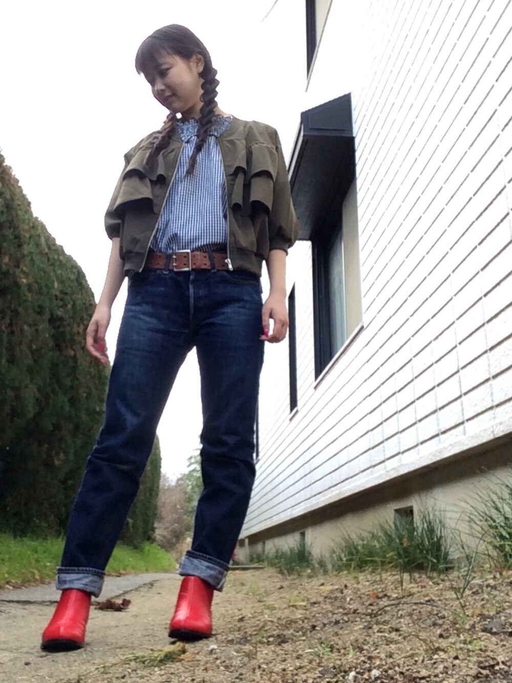 赤いブーツをメインに。 少しメンズライクなコーディネート。