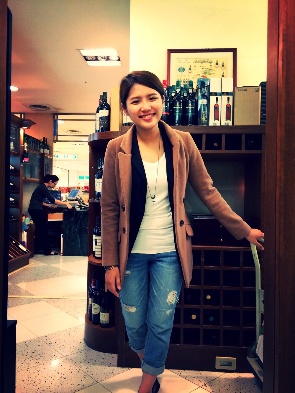 西裝背心搭配素白t,再加上男友BF褲,戴上十字架長鍊拉長身型,著黑樂福,綁個俐落低馬尾、搽上大紅口紅,希望能走個歐美風~(外套純粹本人怕冷保暖用XD)