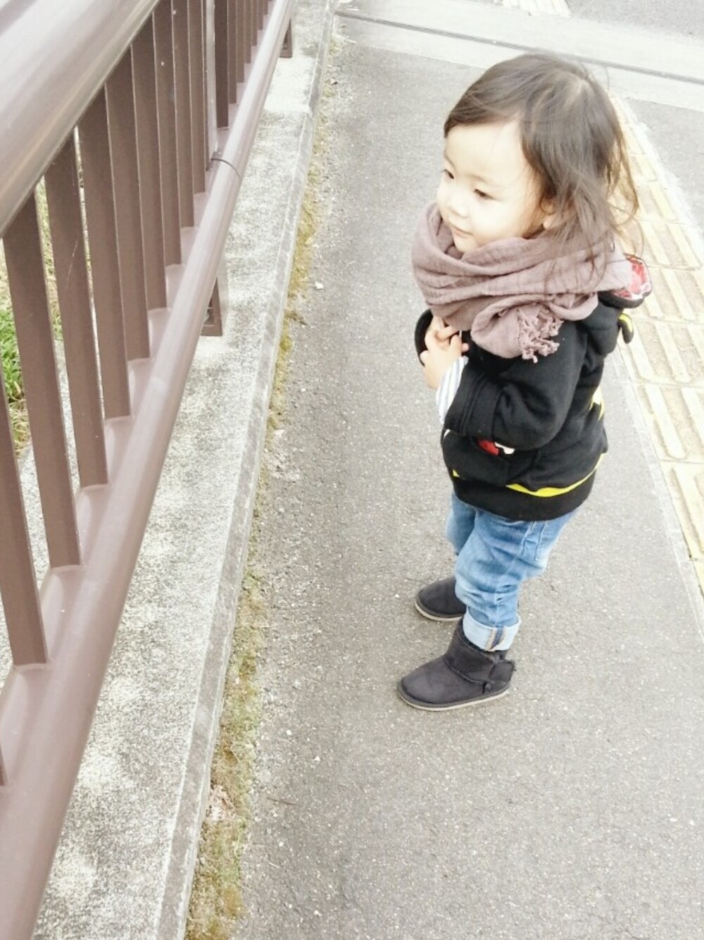 ブルー系のデニムパンツを着用したキッズの秋コーディネートの1枚目の写真