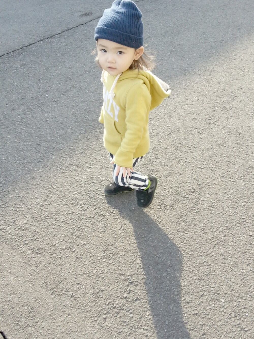 イエロー系のパーカーを着用したキッズの冬コーディネートの1枚目の写真