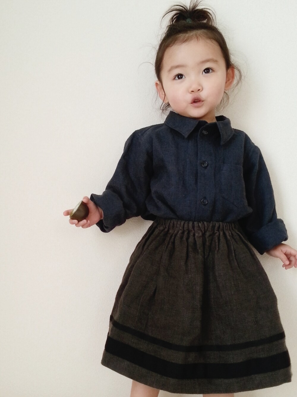 ブラック系のスカートを着用したキッズの春コーディネートの1枚目の写真