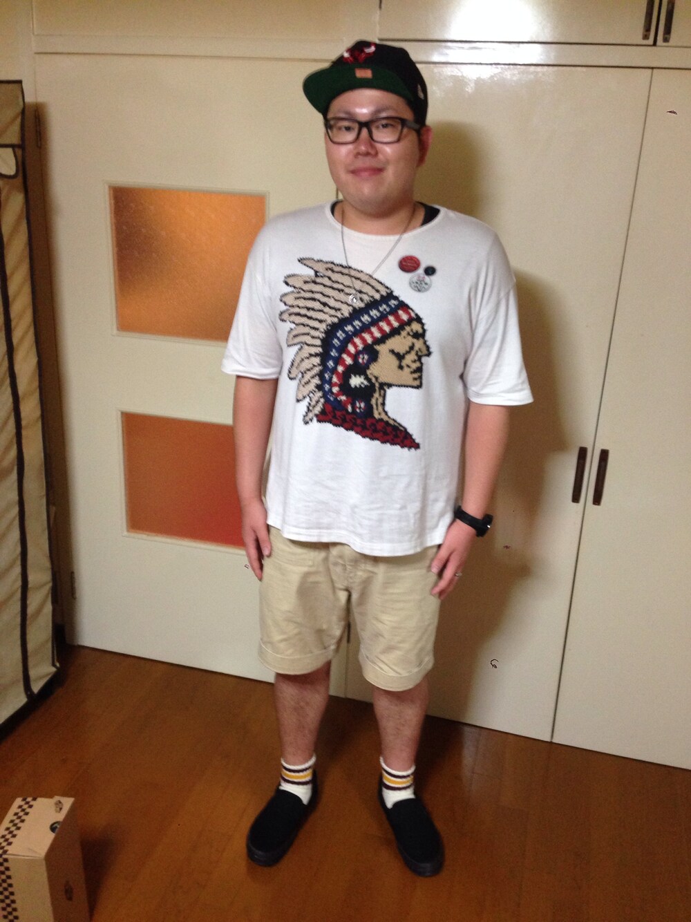 キャップ:NEW ERA ネックレス:ブランド不明 パンツ:Supreme 腕時計:Tendence リング:ブランド不明 暑すぎて顔がテカテカです 泣