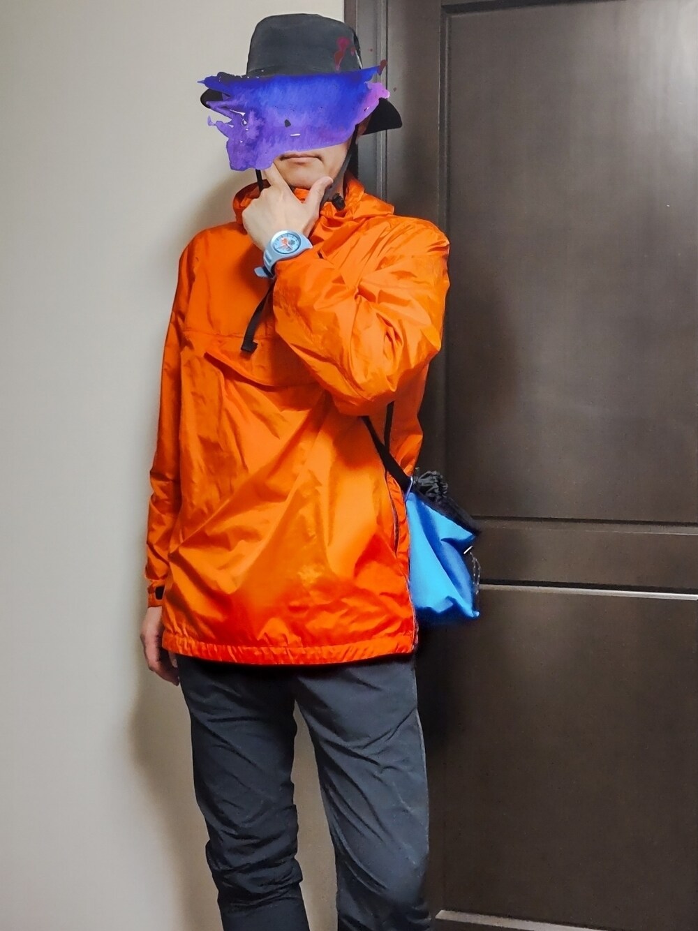 アノラック着回し オレンジ×くろ×みずいろ 山にいそうなコーデ