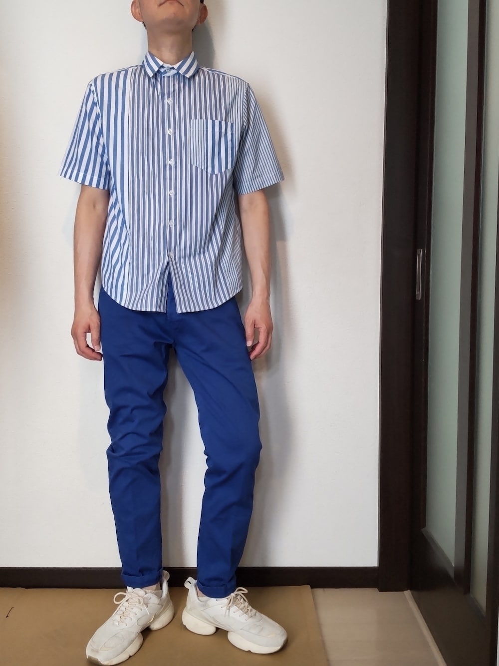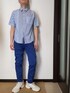 ブルー×ホワイト 柄のインパクトが強いので着こなしはシンプルに