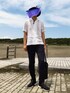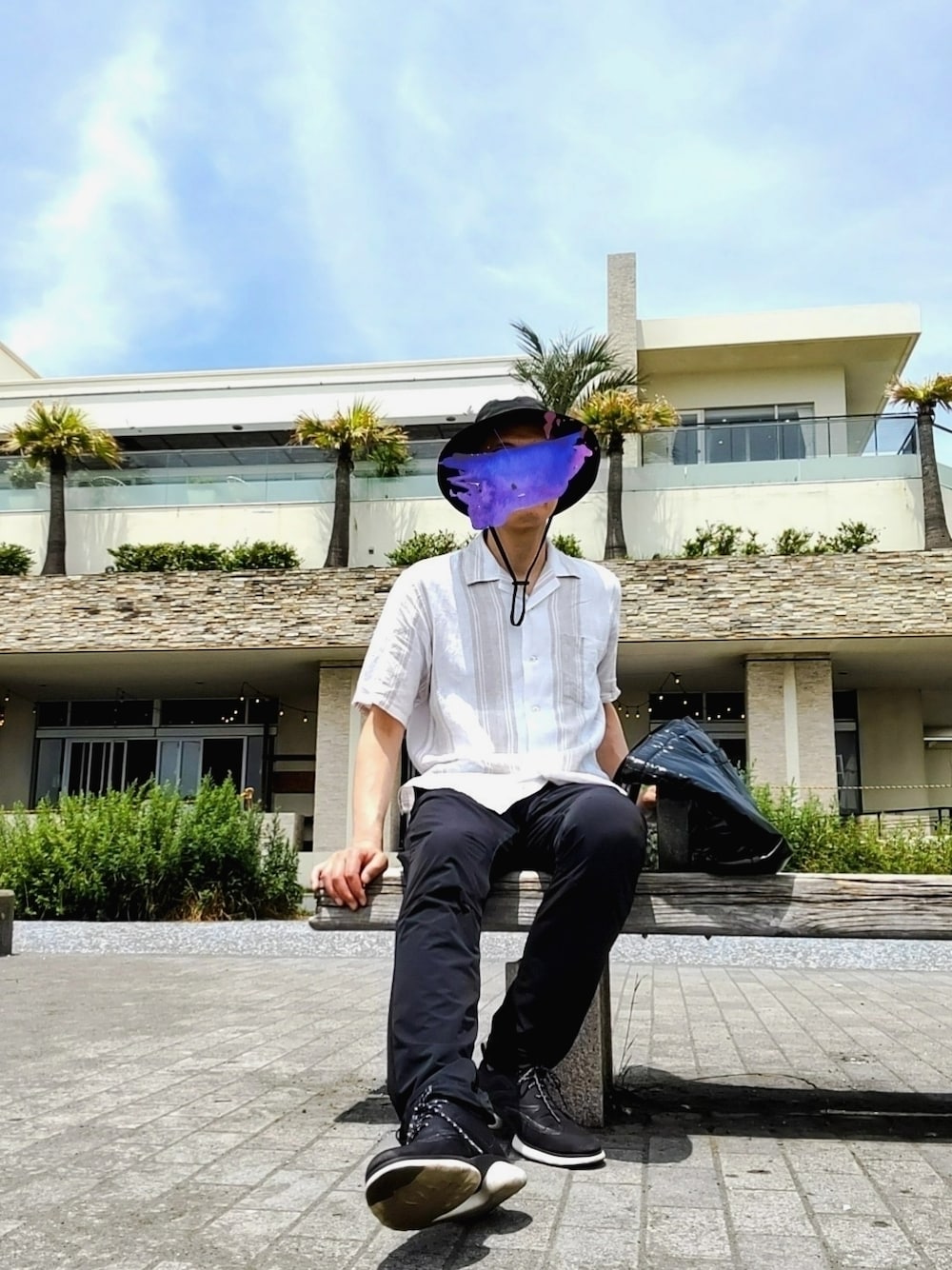 ベージュ×ブラックのコーデ たまには外撮り!海沿い散歩 酷暑かもと思いましたがまだまだ快適 人が多く賑わっていました 海の家の準備も進んでいる様子 夏はもうすぐそこ