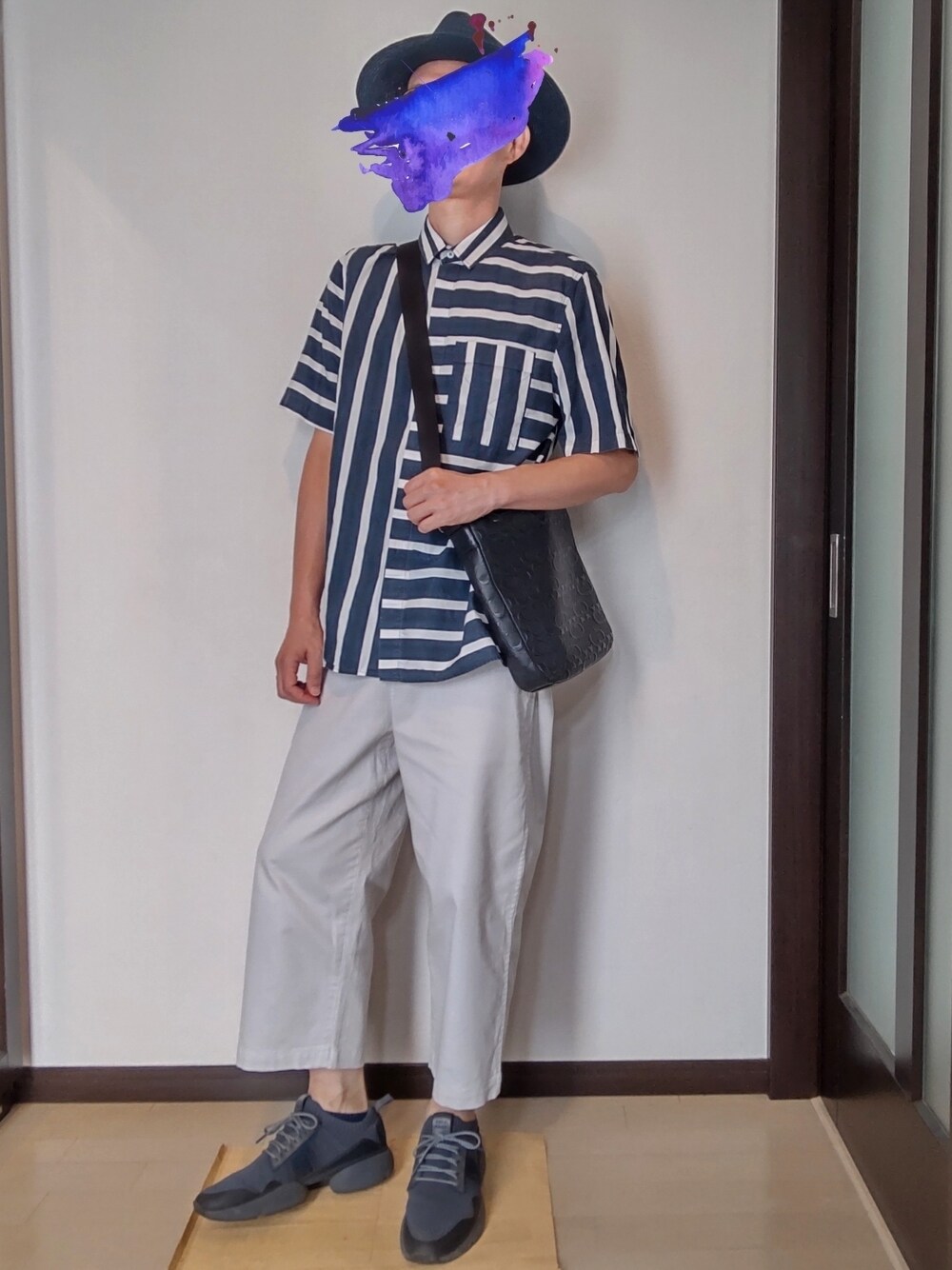 ストライプとボーダーを切り替えたシャツを主役にしたワントーンコーデ