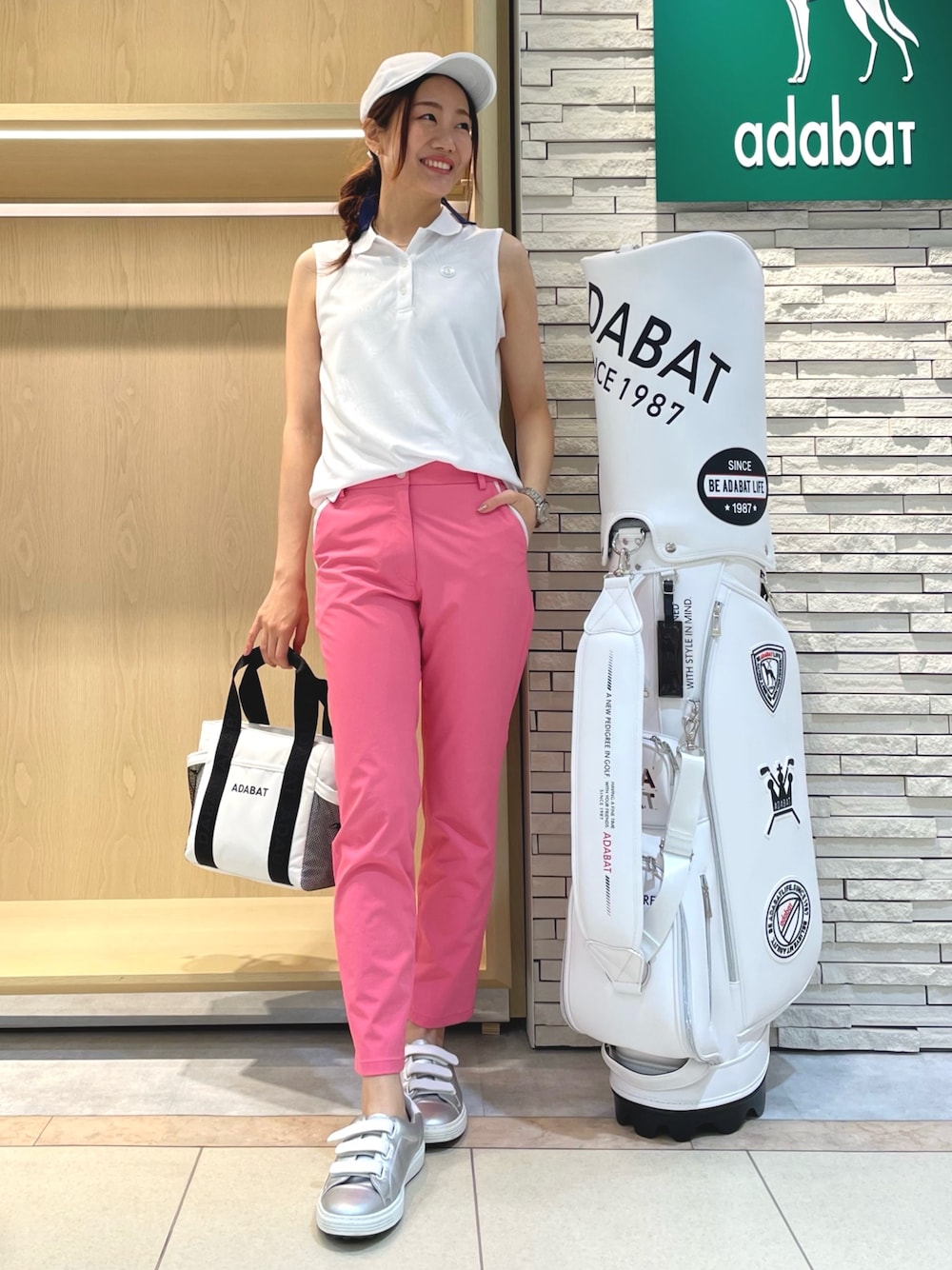 ご覧いただき、ありがとうございます♡ 【ノースリーブポロシャツ】 38(M)サイズ/ホワイト着用 エンボス加工でリーフ柄をデザインした、夏らしい爽やかなアイテムです。半袖焼けが気になる方にもおすすめです。冷却効果をもつ「coolcore(R)(クールコア)」素材を使用しており、真夏も快適にプレーできます。 【ストレッチクロップドパンツ】 36(S)サイズ/ピンク着用 足首がちらっと見える丈なので、涼しげですっきり見えるパンツです。前後のポケット口のホワイトラインがアクセントになるので、トップスはタックインにするのもおすすめです♪UVカット/吸水速乾/接触冷感/透け防止/ストレッチ性抜群 という高機能パンツです!