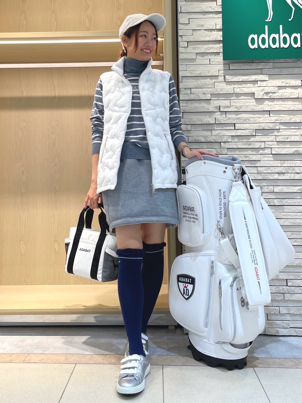 ご覧いただき、ありがとうございます♡ 普段着用サイズ…36(S) 【ハイネック長袖セーター】 38(M)サイズ/ホワイト着用 胸元のadabatのストーンが高級感◎な、長袖セーターです。 一枚あれば何かと使える定番のボーダーデザインなので、ゴルフは勿論、普段着にもオススメのアイテムです。 ご自宅でお洗濯できるのも嬉しいポイント♪ 【ペプラムデザイン ジャージ切り替えベスト】 38(M)サイズ/ホワイト着用 暖かさとデザイン性を両立させた粒中綿のアウターベストです。 後ろ身頃の切り替えデザインが、ふわっと女性らしいシルエットになり、スポーティーになりすぎず女性らしく着こなせます。 ご自宅でもお洗濯できるのも嬉しいポイントです。 粒中綿とは… ◯ダウンよりも早く乾燥する ◯丈夫で濡れても形状を保持する ◯軽く、ダウンのように暖かい という特性を持っています♪ 【中綿 リバーシブルスカート】 36(S)サイズ/グレー着用 表面はジャージ素材のグレーのシンプルな無地デザイン、裏面は滑りのいい素材の千鳥格子デザインで、1枚で両面楽しめる中綿スカートです。 1枚持っておくと、色々なコーディネートと合わせて楽しめます♪ 中綿なので少しボリューム感があるので、ジャストサイズでの着用がオススメです。