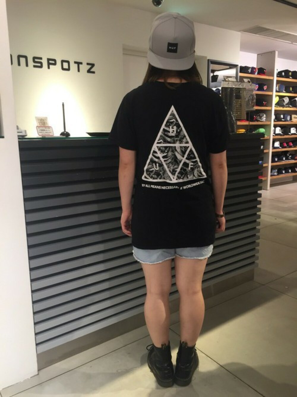 TシャツとキャップをスケーターブランドHUFで合わせたコーディネートです。 キャップはHUF定番のボックスロゴがフロントにセットされたものです! アジャスタブル部分にHUFのピスネームが付いており、シンプルながらも こだわりのあるキャップになっているのでオススメです。