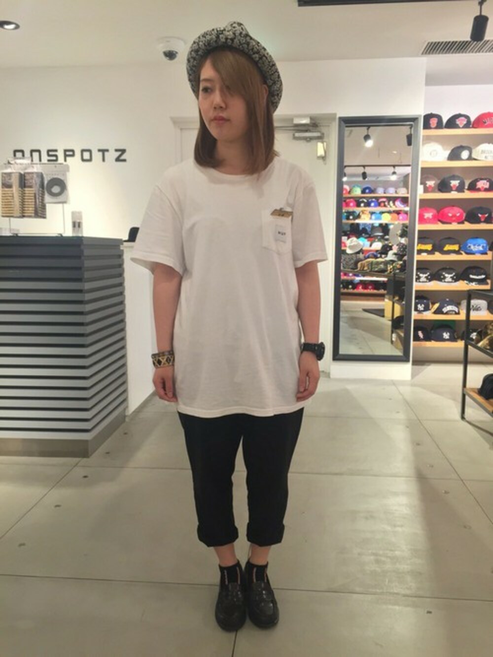 細かい花柄が全体にプリントされたCABALLEROのハットを着用しました。 落ち着いた色味なので男女問わず被って頂ける大人なデザインです。 全体的に無地のモノトーンでまとめ、帽子が主役になるコーディネートにしました。