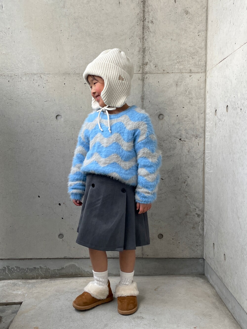 水色✖️グレー✖️アイボリー ふわふわ素材であったかコーデ🫶🫧 プリーツスカートまだ大きめだから 膝上にはならず🙂↕️ 110𝕔𝕞でも良かった気もするセットアップ でも長く使お😏🤘 ご覧頂きありがとうございました🦭