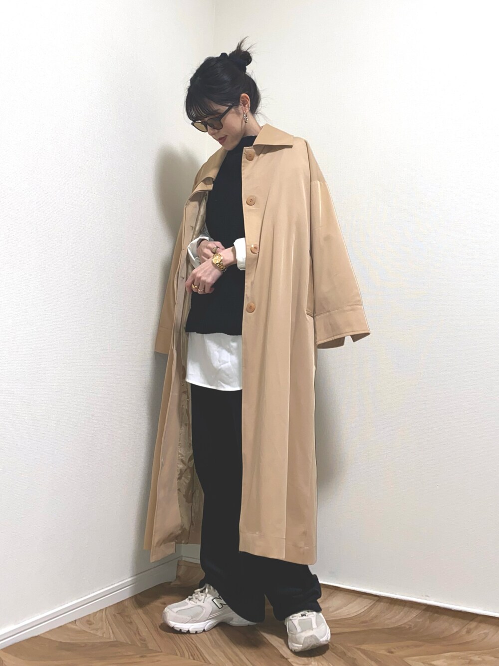 HITOMIのステンカラーコート「【yun_wearコラボ】フェイクレザーショートブルゾン+フレアロングコートセット」を使ったコーディネート