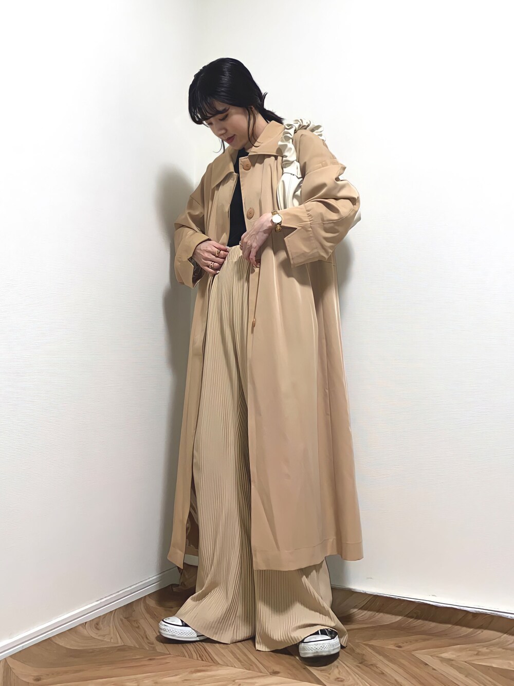 HITOMIのステンカラーコート「【yun_wearコラボ】フェイクレザーショートブルゾン+フレアロングコートセット」を使ったコーディネート