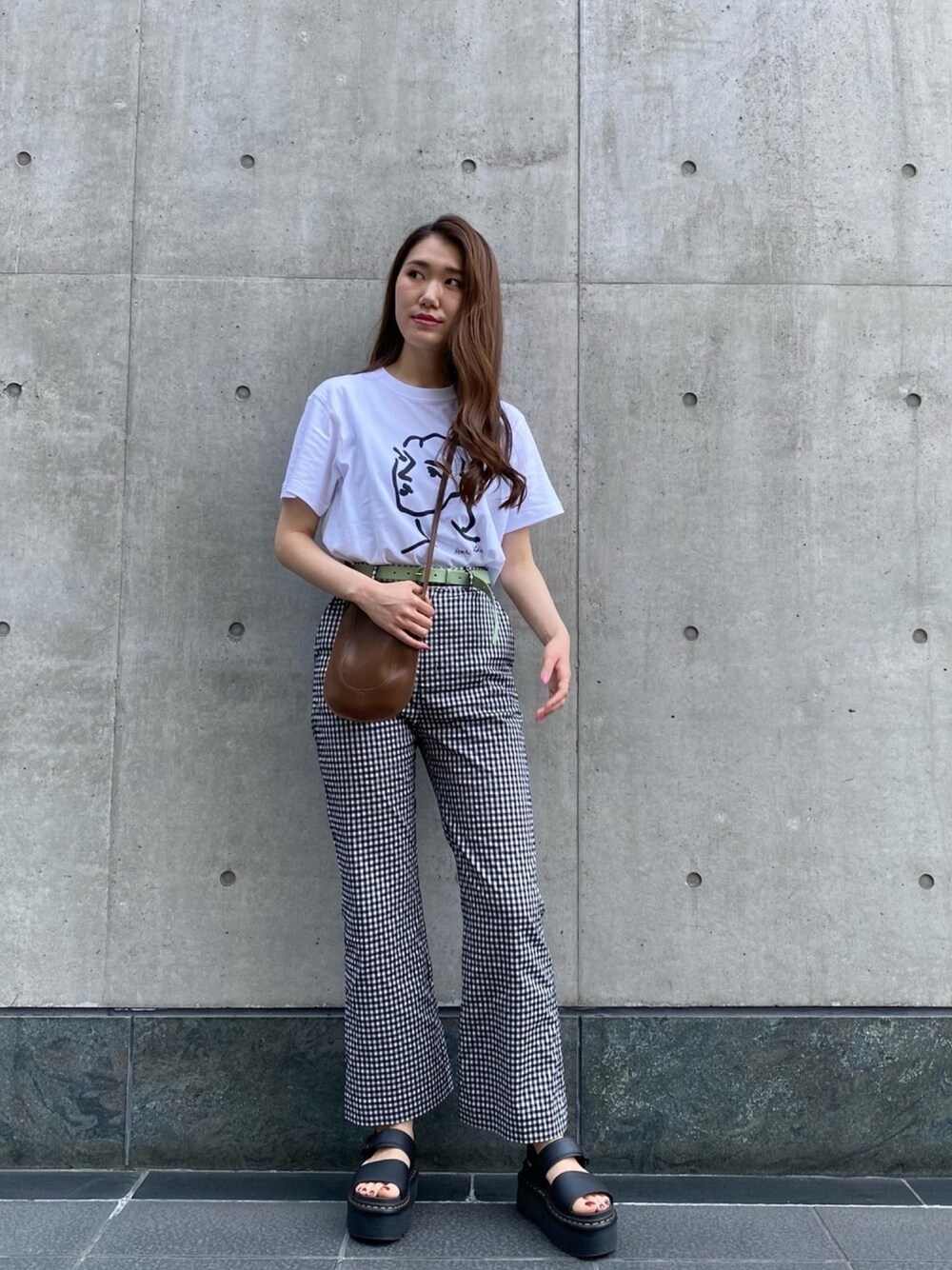 カラーベルトをポイントに、ギンガムチェックのパンツとでモノトーンでまとめてみました。 ゴツめのサンダル合わせでボリューム感を足すとこなれ感もアップしますよ◎