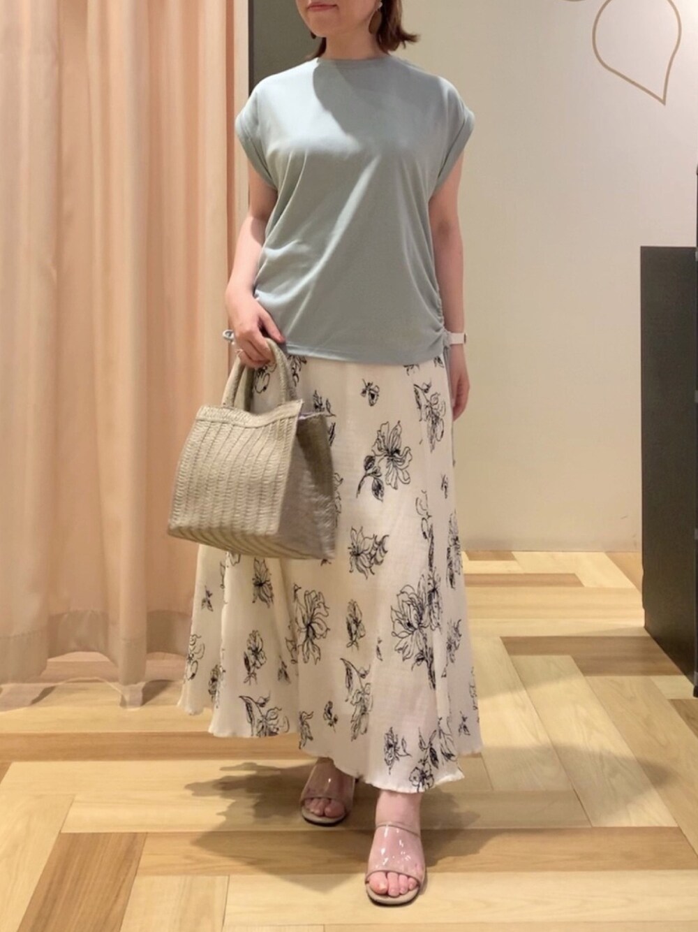 こんにちは☺︎ ミント×ホワイトで合わせてみました! トップスはサイドが絞りになっています◎ スカートで女性らしくしてみました。 パンツスタイルにもおすすめです!