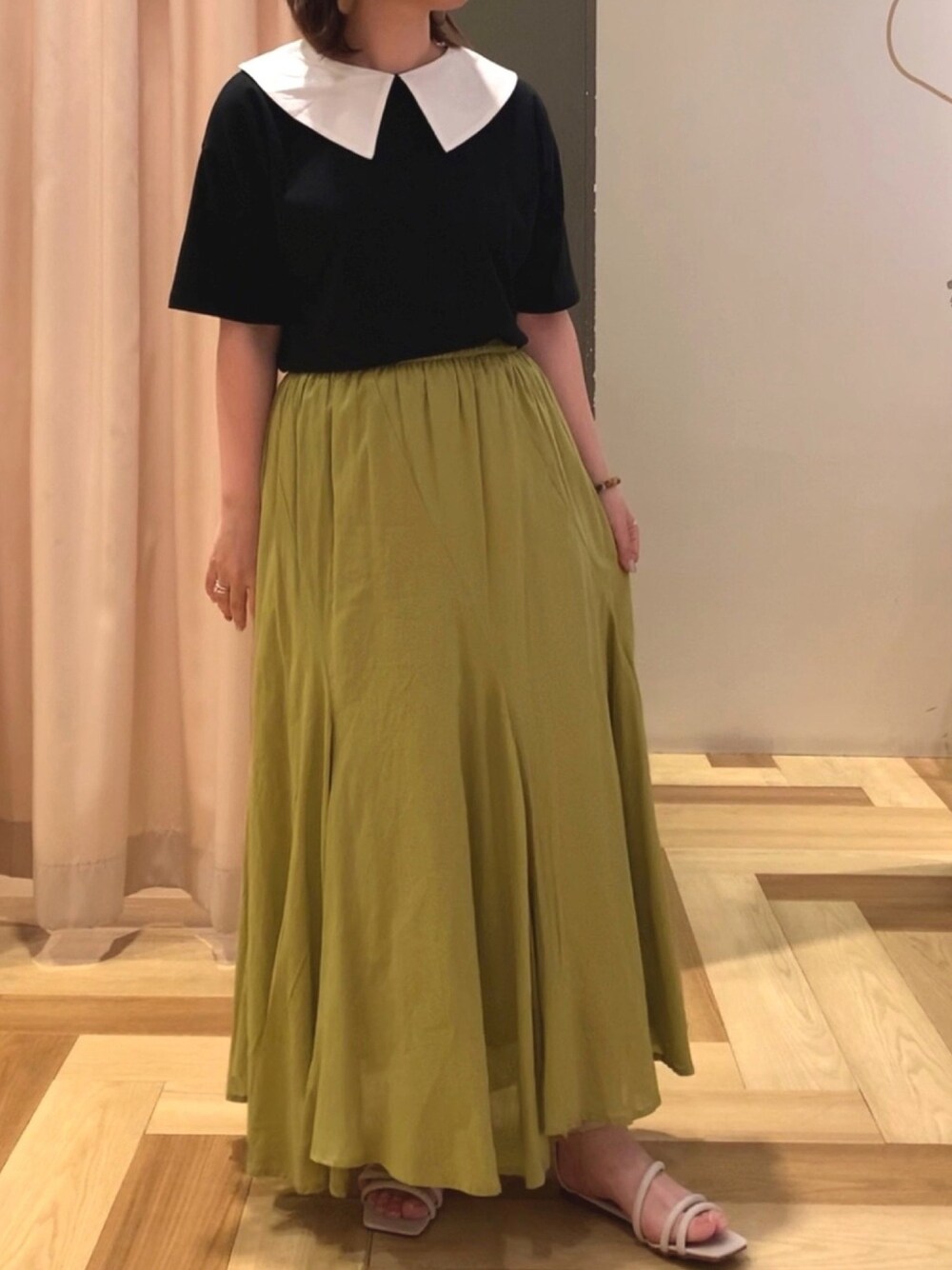 こんにちは! 襟付きトップスにマキシ丈スカートを合わせてみました。 トップスは襟がポイントになっております。 スカートはコットン素材で軽いです! サラッとしていて肌触りいいですよ。