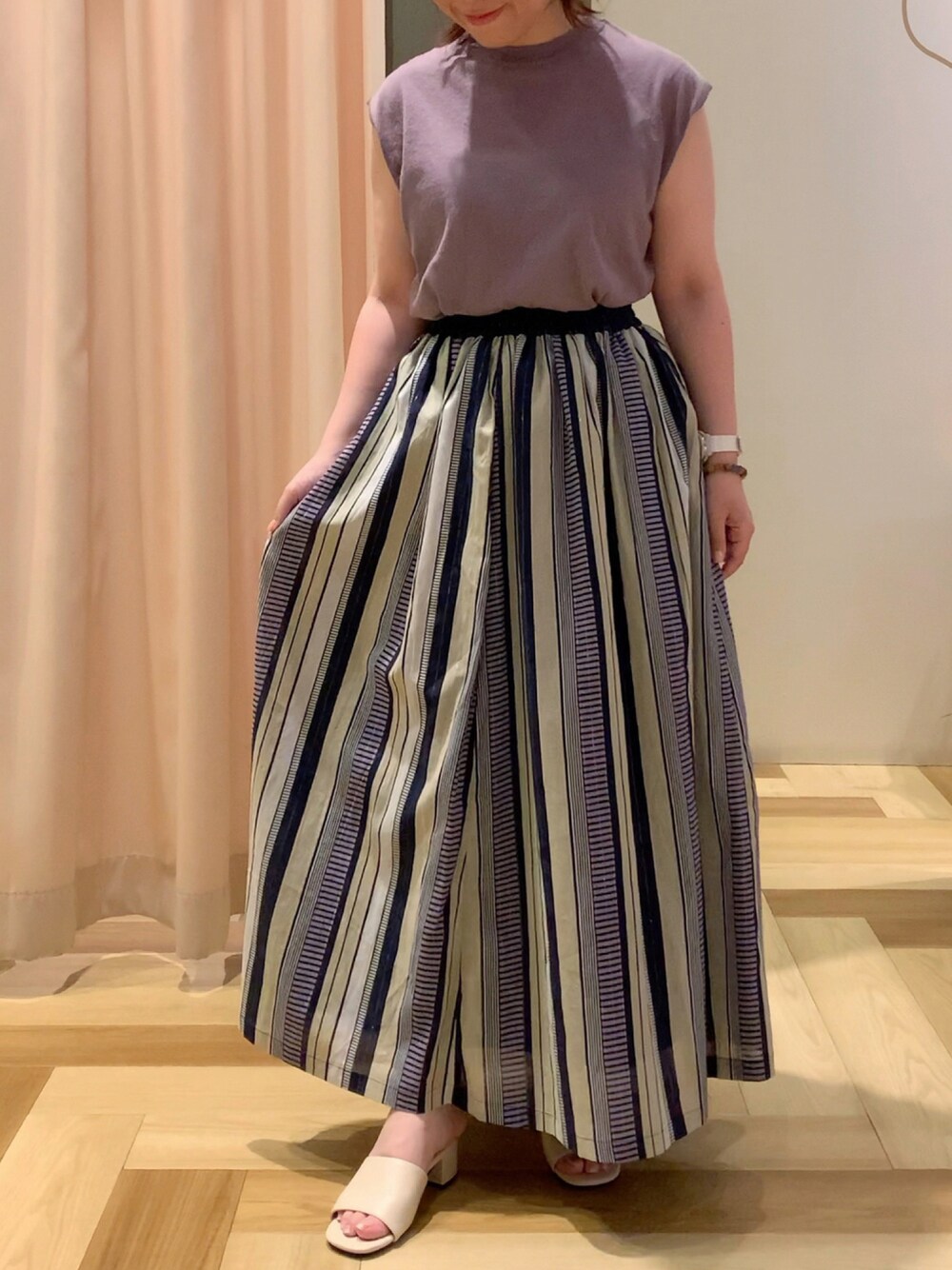 こんにちは☺︎ 本日のコーディネートです。 トップス リネン素材で、涼しいです。 腕はスッキリ見せる事ができます! スカート デザインが切替になっていて可愛いです。 長めの丈ですが、足はしっかり見えます◎ ヒールのあるサンダルで合わせるとバランスが良さそうです。