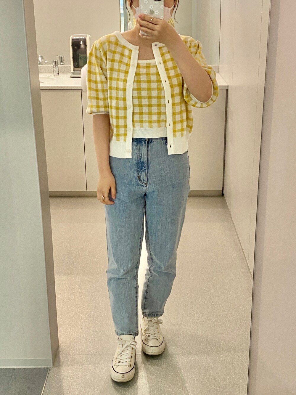 こんにちは☺︎ 今回も数多くのコーデの中からご覧いただきありがとうございます🌸 ----チェックコーデ---- 黄色×青の組み合わせにしました! 中のキャミが形もすごく可愛くてお気に入りです♡