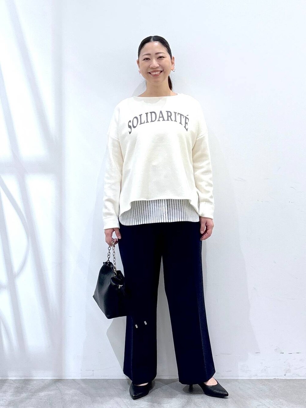 《158cm/サイズ&着用感》 着用は全てレギュラーサイズの物着用しています。 ▶︎はつなボディサイズ 身長158cm 体重62kg〜64kg 胸囲95cm ウエスト78cm ヒップ96cm 二の腕30cm 足24.5cm (24cmよりの中途半端サイズ) ▶︎ニット M サイズ 綿混素材の厚手のカットソーのようなニット。 夏以外に使いやすい柔らかい素材と、身幅がゆったりめのデザインで中に着込めるサイズ感が長いシーズン着回して頂ける1枚。 ゆったりデザインですが、バランスよく見える絶妙な丈感が身体のラインを拾わずすっきりとした印象で着て頂けます。 袖丈は長めデザインなので、折り返すアレンジで着ています。 内側におったり、くしゅっとさせたり着こなしにあわせて手元の印象を変えれます。 ▶︎シャツFREEサイズ エルーラ1番人気シャツシリーズのアイロンイラズシャツ! 流行り廃りのないシンプルなデザインに、シャツを着た後の面倒なアイロン作業いりません! 少しシワがいっても、脱水時間を短縮して干せば復活! 気兼ねなくシャツのスタイリングを楽しんでいただける1枚です。 158cmでおしりがすっぽり隠れる丈感ですが、前は少し短めなので前だけインスタイルも楽しんでいただける着回しのきく人気アイテムです。 ▶︎ボトムスMサイズ 洗濯してもシワになりにくく、流行り廃りに左右されないシンプルなデザインと生地がON/OFFどちらでも着回しができる綺麗見えワイドパンツ。 ウエストがゴムなのにリラックスしながらも上品に着ていただけます。 セレモニーはもちろん、お仕事にプライベートと幅広く着回して頂けます! ▼▽▼▽▼▽▼▽▼▽▼▽ 見て頂き、ありがとうございます! 使用アイテムは下記に記載がございます。 ⚪︎いいね ⚪︎フォロー 嬉しいです、ありがとうございます。 ▲△▲△▲△▲△▲△▲△