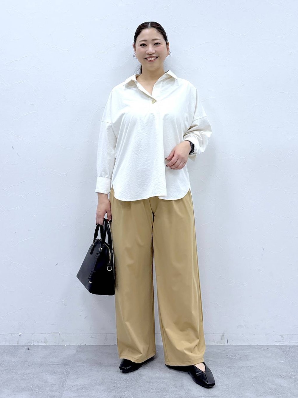 ▶︎はつなボディサイズ 身長158cm 体重62kg〜64kg 胸囲95cm ウエスト80cm ヒップ96cm 二の腕30cm 足24.5cm (24cmよりの中途半端サイズ) ▶︎シャツFREEサイズ エルーラの人気アイテム「アイロンイラズ」シリーズのスキッパーシャツ。 季節問わずに着て頂けるベーシックカラーと、身体のシルエットを拾わないゆとりのあるサイズ感がシーズン問わず長く着ていただけます。 スキッパーデザインが着るだで顔まわりをすっきりとした印象にしてくれる1枚。 158cmでおしりがしっかり隠れる丈感で、流行り廃りなく着回せるシンプルなデザインが1枚でもカーディガンやニットを重ねても楽しめる1枚です。 ▶︎パンツMサイズ 艶感が綺麗なワイドパンツ。 ストンと落ち感のあるサラサラ生地が肌あたりも柔らかく着心地の良い1枚。 適度に肉厚な生地なので、真冬、真夏以外長く着ていただけます。 しっかりしたワイドシルエットなので、中にインナーパンツやタイツなどを履いてもまったく気にならずに履いていただけます。 ウエストは80cmの私でもゴムで楽ちんな履き心地でした。 ▼▽▼▽▼▽▼▽▼▽▼▽ 見て頂き、ありがとうございます! 使用アイテムは下記に記載がございます。 いいね フォロー 嬉しいです、ありがとうございます。 ▲△▲△▲△▲△▲△▲△