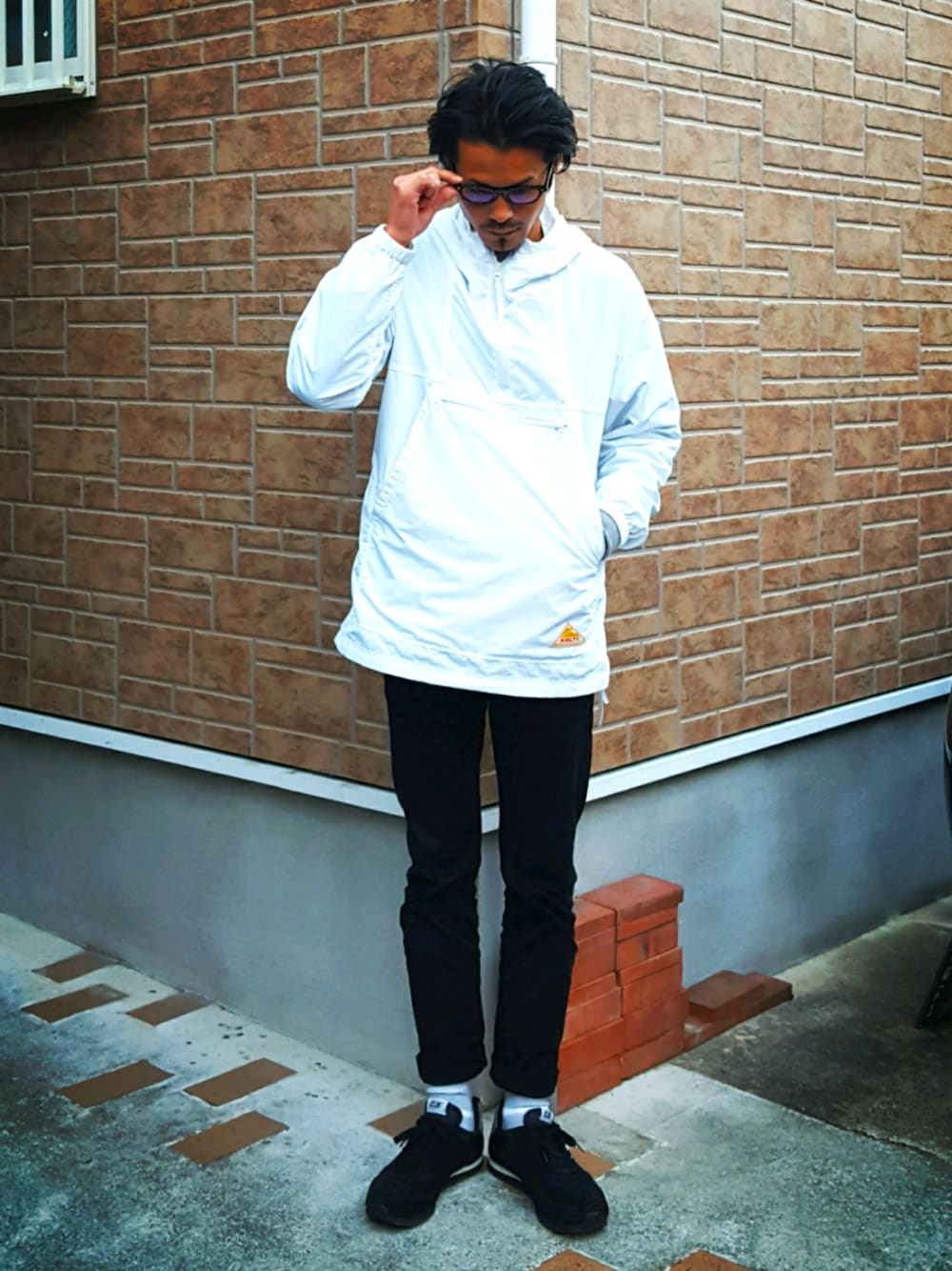 Pilgrim Surf+Supply 〈SUNNY SPORTS × KELTY〉 プルオーバーナイロンジャケット DIESEL ブラックパンツ 55DSL ランニングシューズ かぶりのナイロンジャケットはオーバーサイズで! でかいので中に着込めるぞい👍 このまま走れそうね🐜