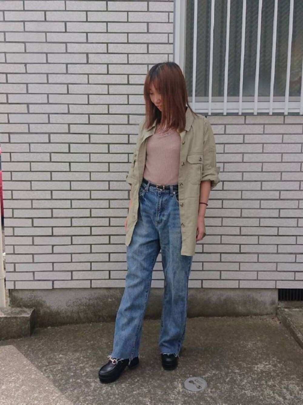 ✨大人カジュアルコーデ✨ ストレートデニムパンツに、リネン素材のシャツを合わせて大人カジュアルに💚