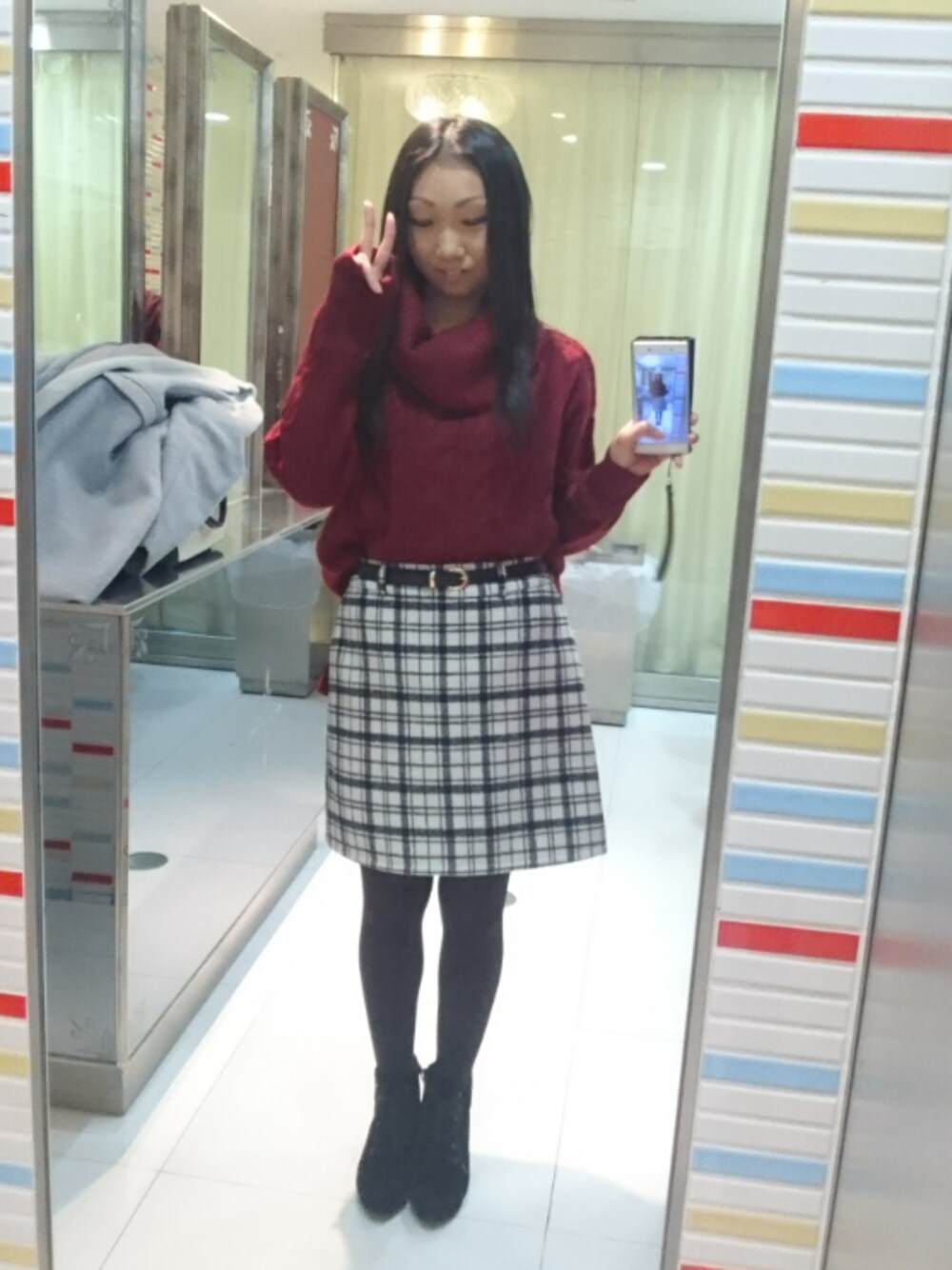 ✨INGNI…グレーチェスターコートこーで✨ ✨アウター無しバージョン✨ ボルドータートルネックニット×チェック台形スカートをあわせて✨ 前回あわせた…ベージュニットより… ボルドーを、あわせたほうが…暖かみを、感じるのは、あたしだけでしょうか😳💓❓❓ ボルドーだからなのか…顔を、隠したやつは…ニットが、暗くうつってしまい… 顔出しになってしまいました…🙈💓💦💦 すいません🙈💦
