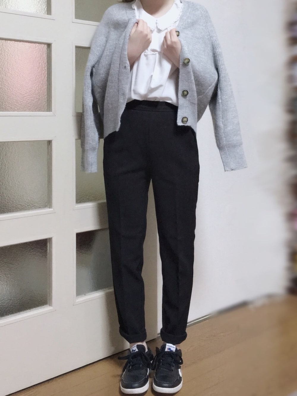 投稿するか悩んだコーデ① 普通の仕事行く格好😳 オフィスカジュアルには よくスニーカーを合わせてしまう… パンツはタックも何にも入ってないから 太ったら絶対に履けないので 私的に攻めた格好😂👏 (既にちょっとピチピチ) カーディガン S ブラウス F パンツ S